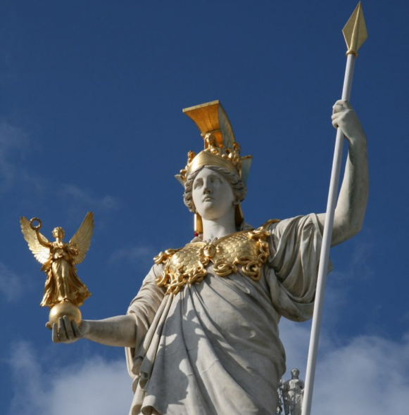 Древнегреческая Богиня Афина Паллада, дочь Зевса, равная отцу, известна как Богиня мудрости и справедливой войны. А также покровительница, культуры, труда, ремесел, ткачества, образования, науки, медицины, государства, мореходства, искусства... по сути весь перечень профессий.